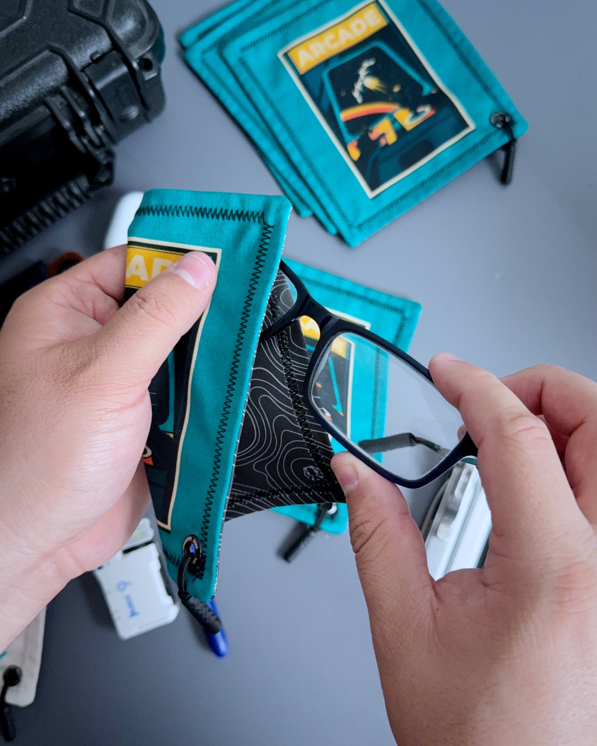MODERN EVERYDAY CARRY MINI HANDKERCHIEF (5" X 6") FEATURING AN ARCADE MACHINE ILLUSTRATION. LENS GRADE MICROFIBER BACKING TO KEEP YOUR DAILY ESSENTIALS SMUDGE-FREE.
