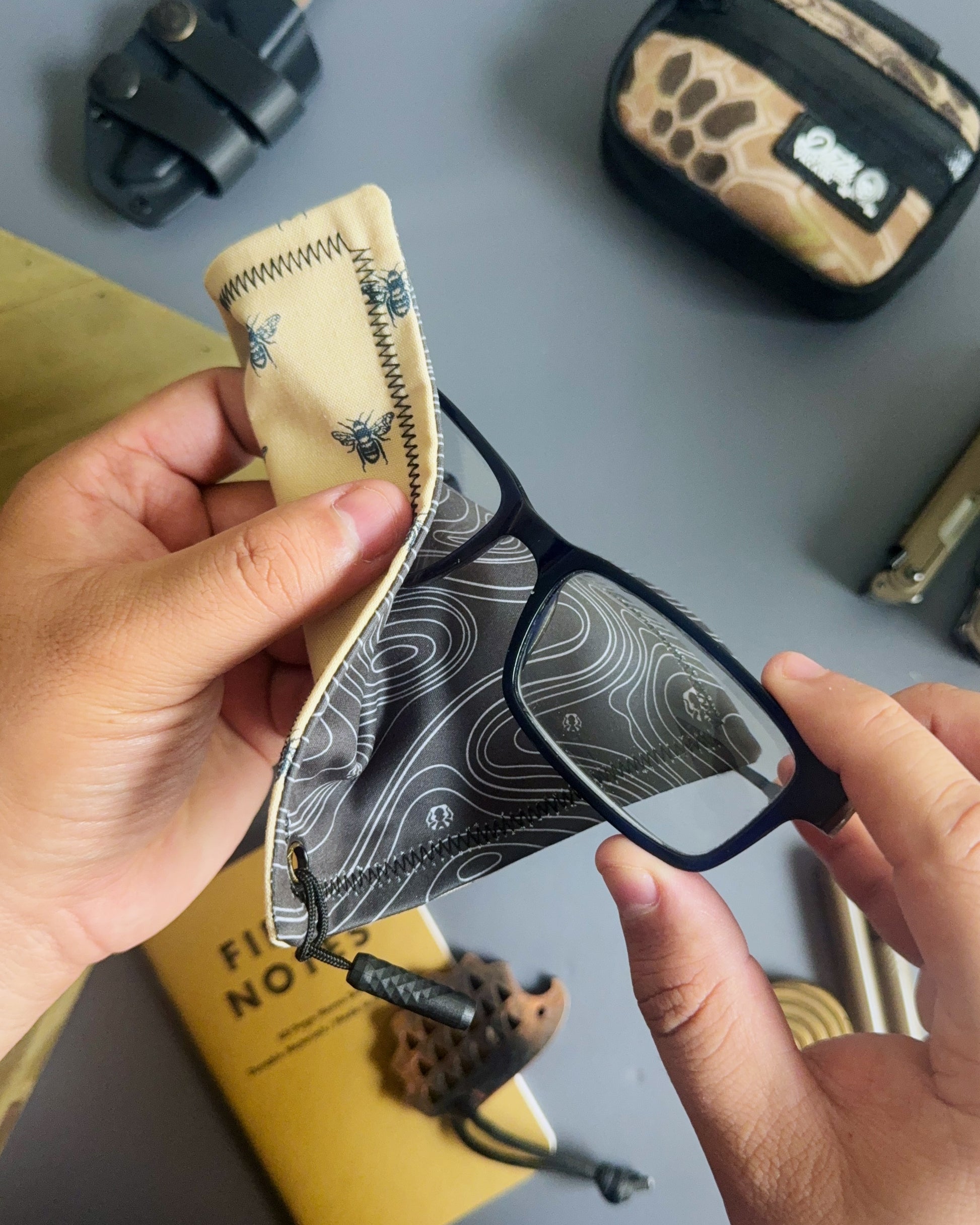 MODERN EVERYDAY CARRY MINI HANDKERCHIEF (5" X 6") FEATURING A BUMBLE BEE PATTERN. LENS GRADE MICROFIBER BACKING TO KEEP YOUR DAILY ESSENTIALS SMUDGE-FREE.