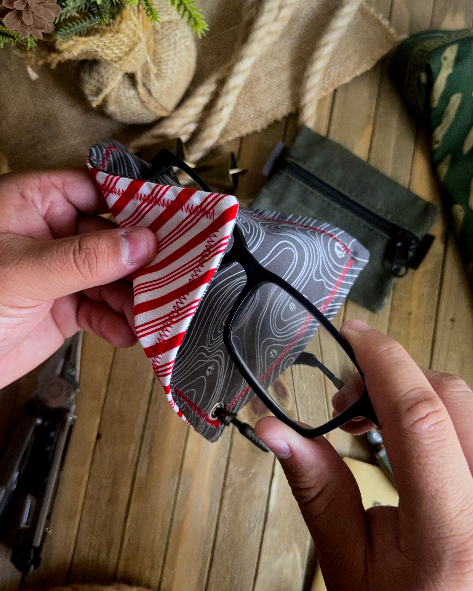 MODERN EVERYDAY CARRY HANDKERCHIEF FEATURING A RED AND WHITE CANDY CANE PATTERN. LENS GRADE MICROFIBER BACKING TO KEEP YOUR DAILY ESSENTIALS SMUDGE-FREE.