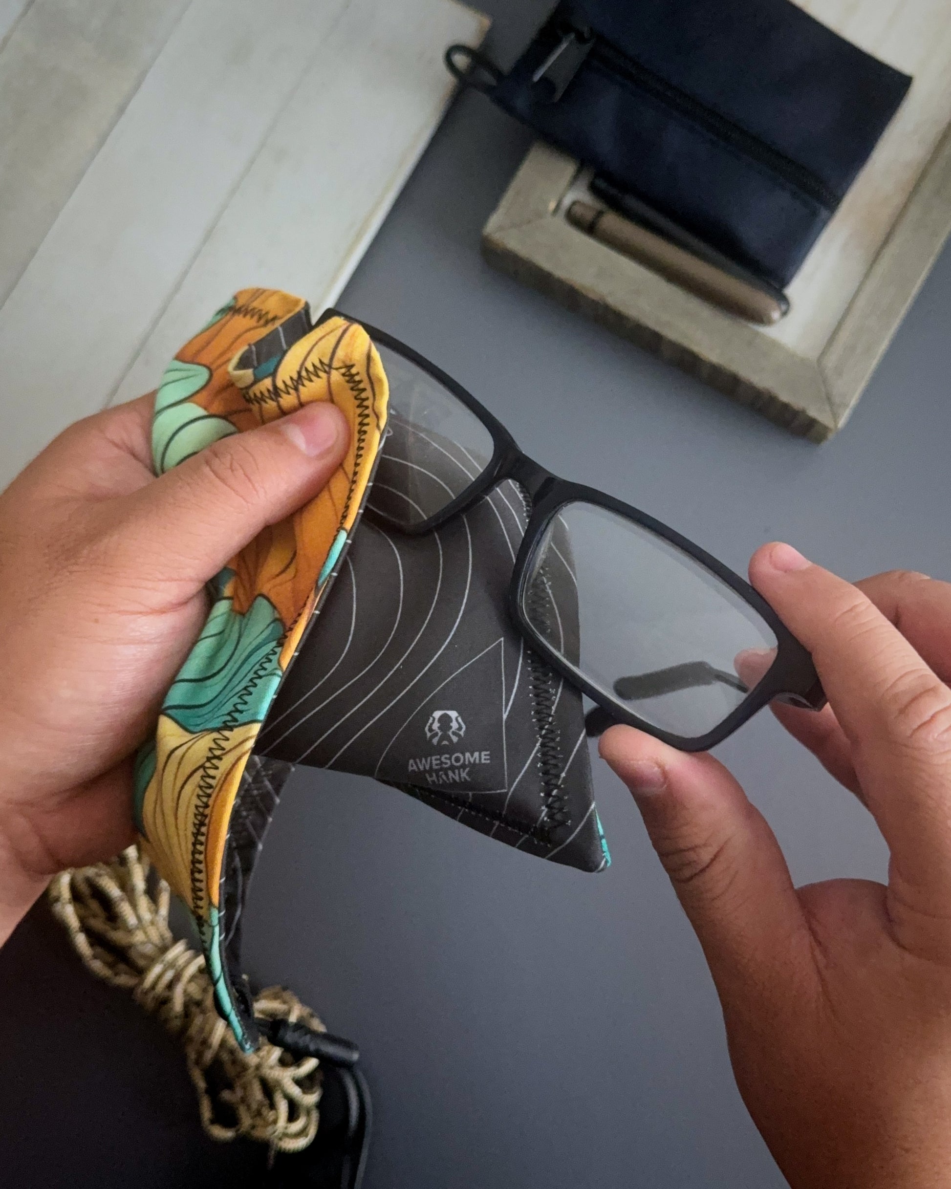 AWESOME HANK IS THE MODERN HANDKERCHIEF THAT IS DESIGNED FOR EASY CARRY AND WILL KEEP YOUR GLASSES, PHONE SCREEN, WATCH, CAMERA AND OTHER ESSENTIALS CLEAN.