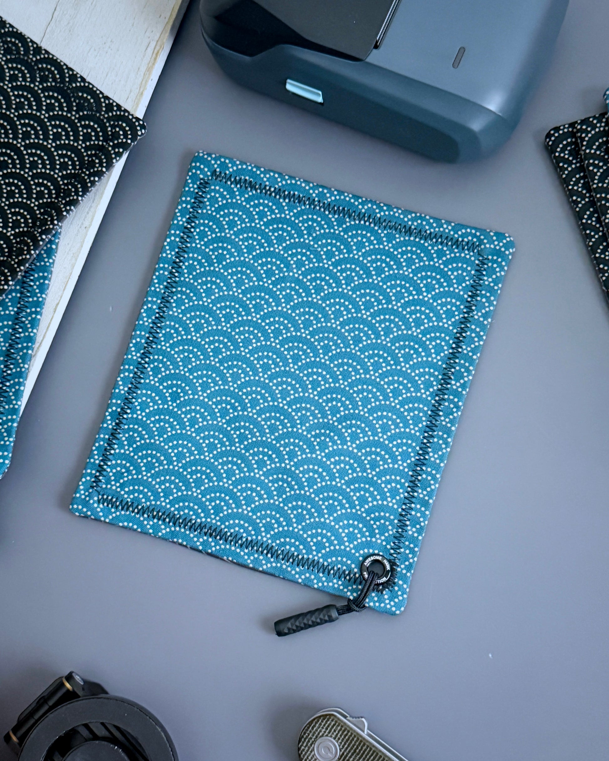 MODERN EVERYDAY CARRY HANDKERCHIEF FEATURING A DOTTED SEIGAIHA PATTERN IN TEAL. LENS GRADE MICROFIBER BACKING TO KEEP YOUR DAILY ESSENTIALS SMUDGE-FREE.