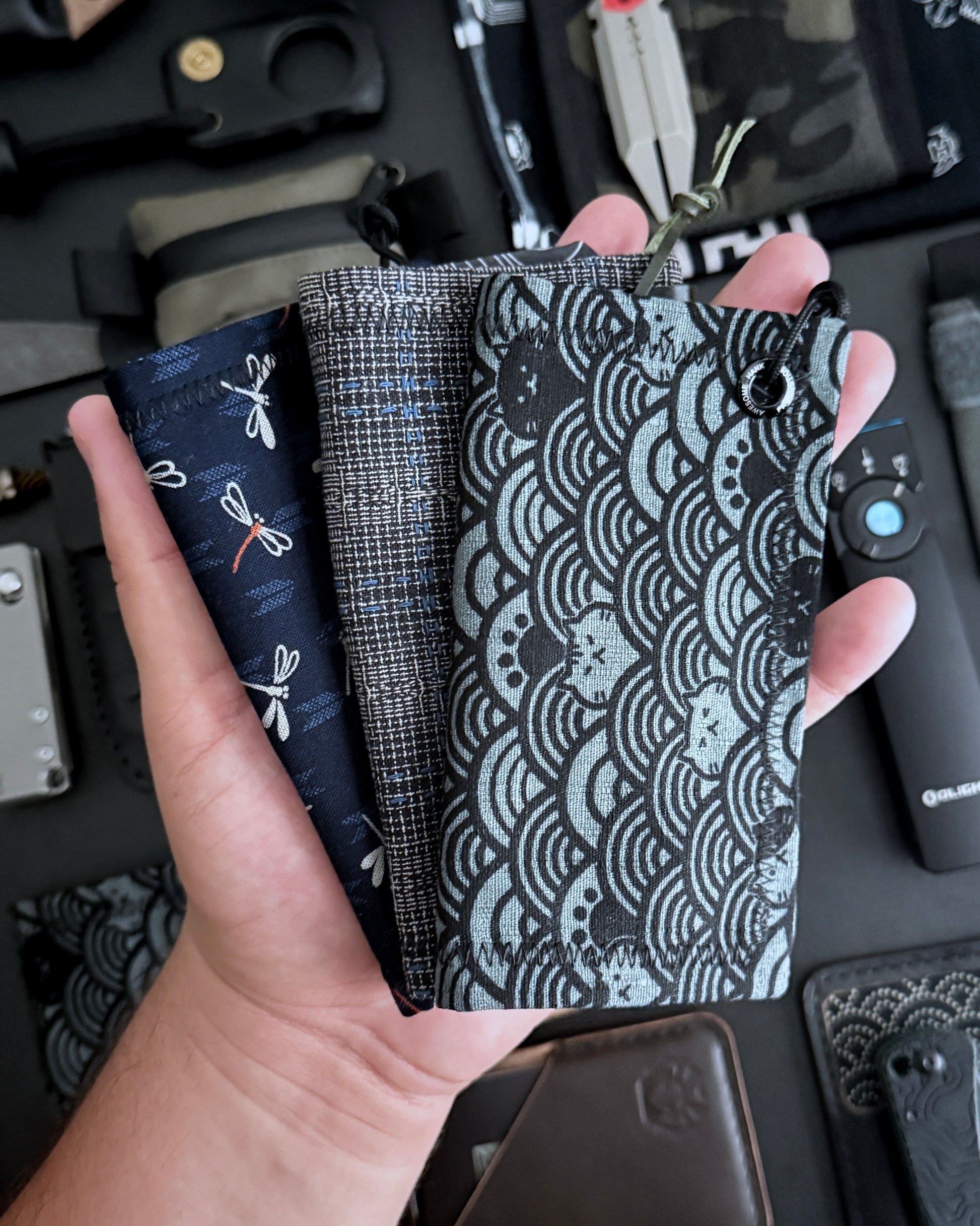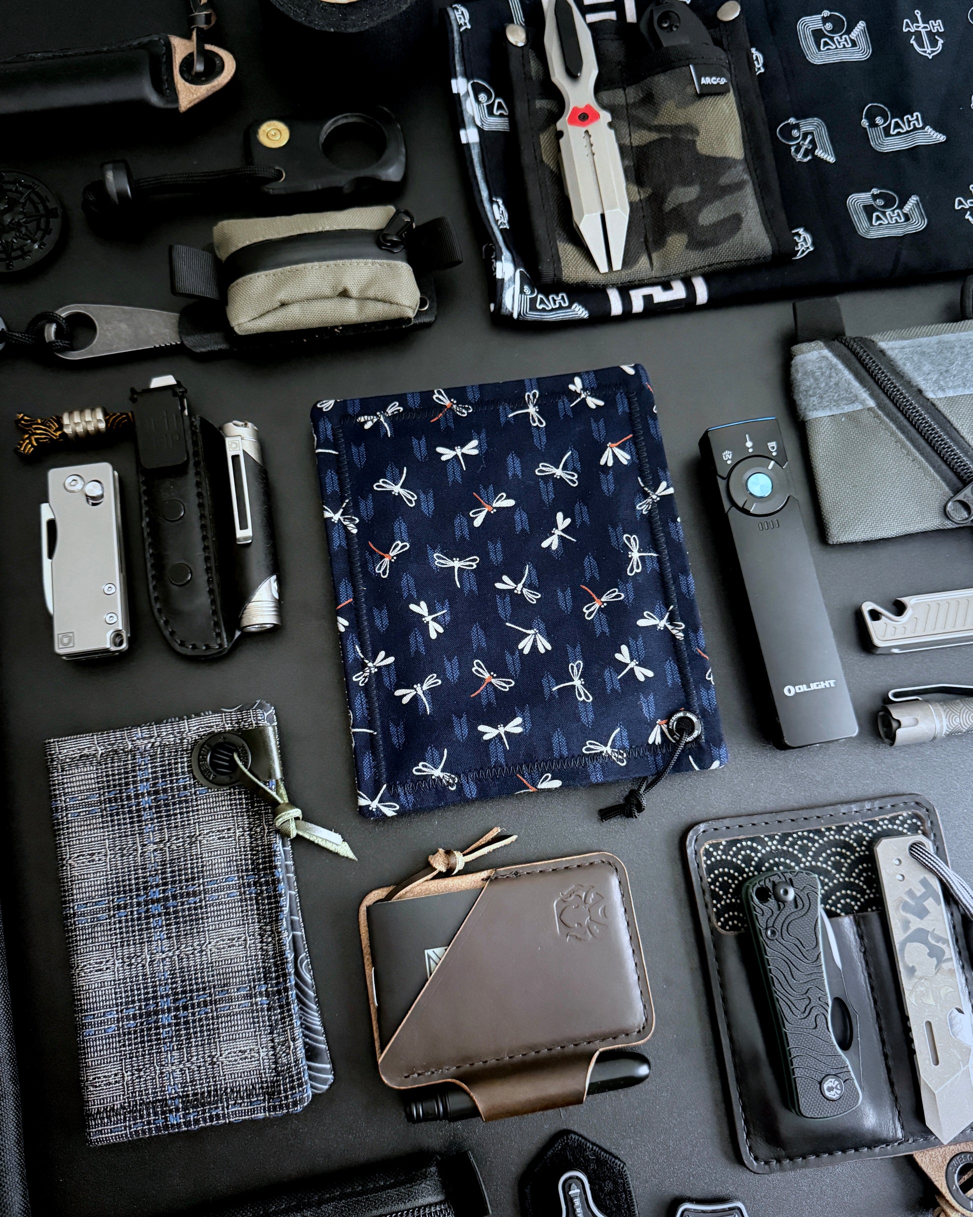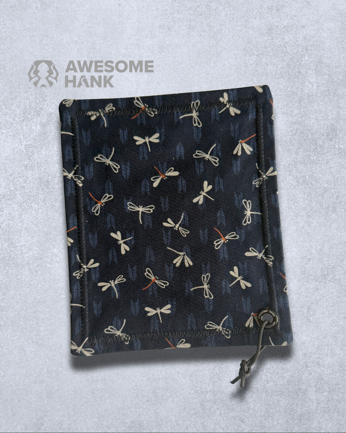 MODERN EVERYDAY CARRY HANDKERCHIEF FEATURING A JAPANESE STYLE NAVY DRAGONFLY PATTERN. LENS GRADE MICROFIBER BACKING TO KEEP YOUR DAILY ESSENTIALS SMUDGE-FREE.