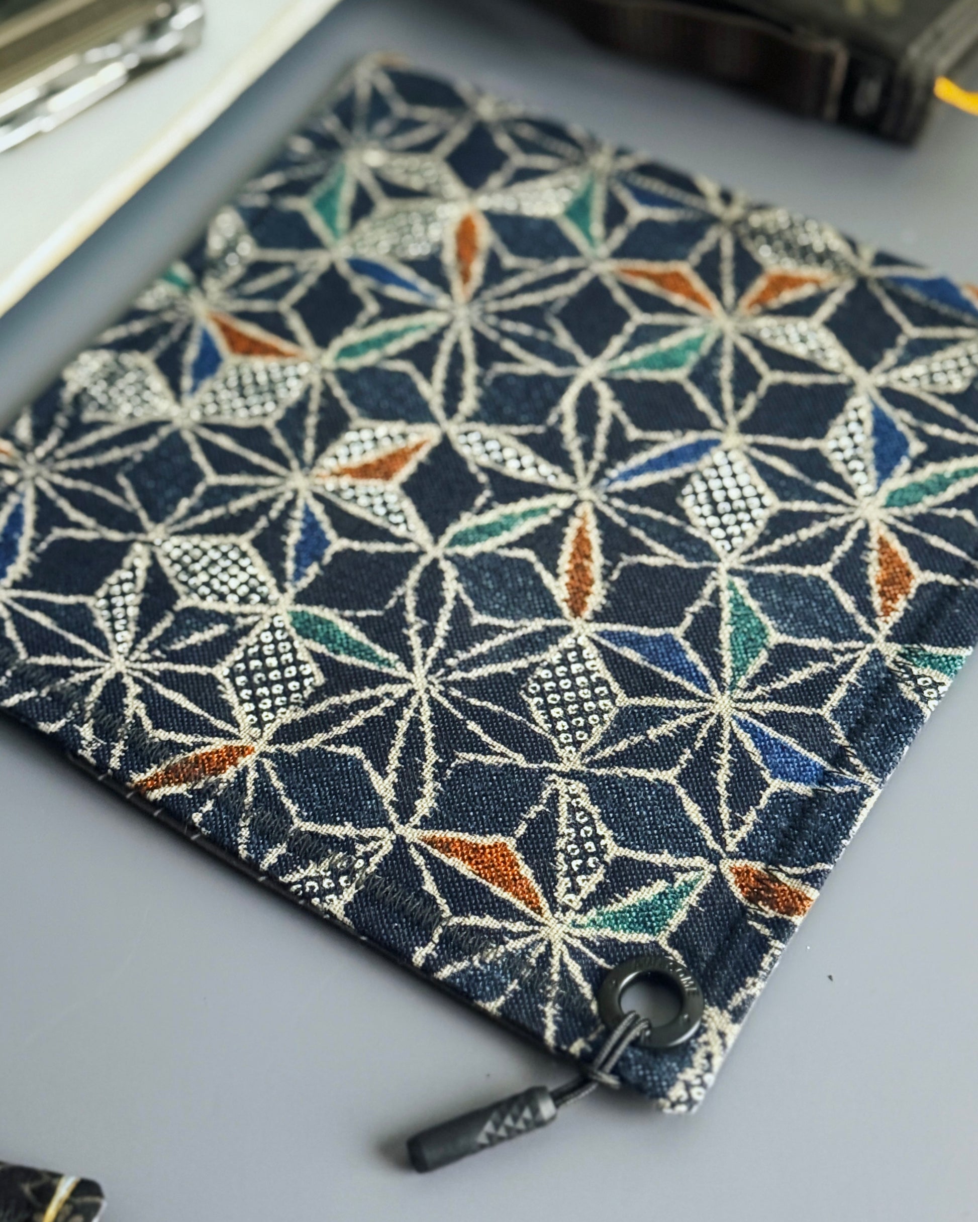 MODERN EVERYDAY CARRY HUSKY HANDKERCHIEF (7.5" X 7.5") FEATURING AUTHENTIC JAPANESE ECRU ASANOHA PATTERN FABRIC IN NAVY. LENS GRADE MICROFIBER BACKING TO KEEP YOUR DAILY ESSENTIALS SMUDGE-FREE.