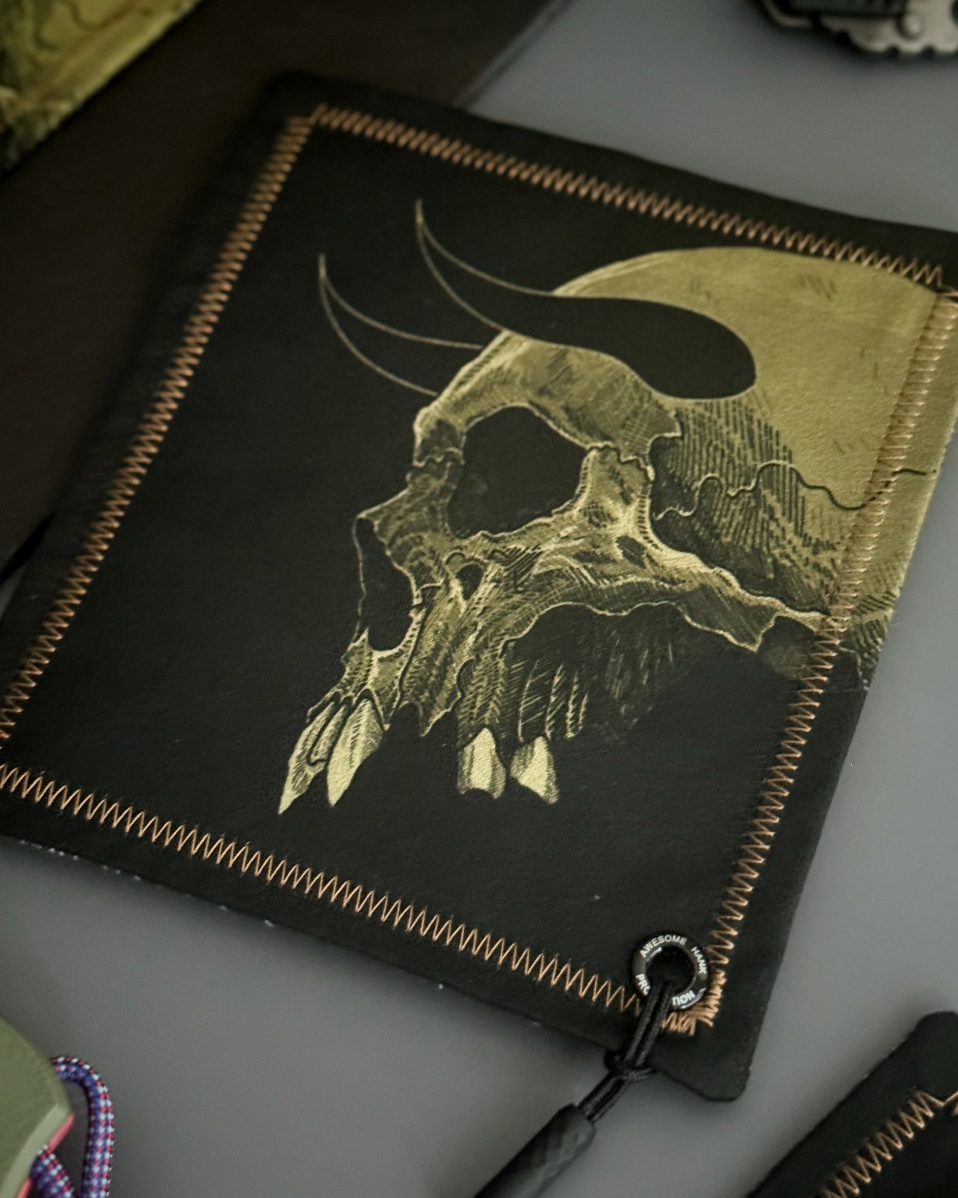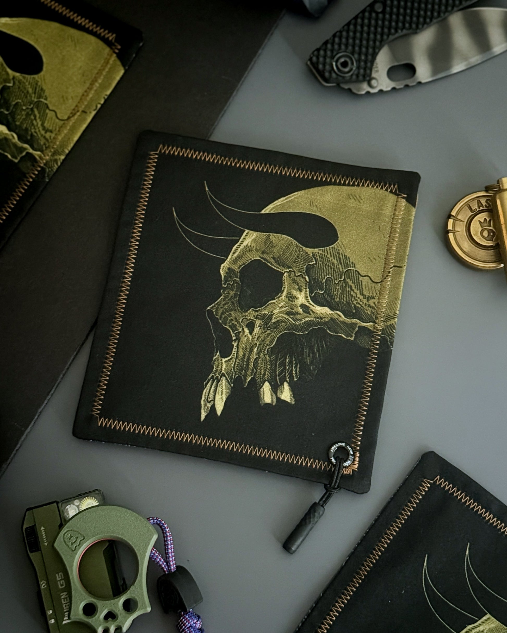 MODERN EVERYDAY CARRY MINI HANDKERCHIEF (5" X 6") FEATURING A FERAL SKULL ILLUSTRATION. LENS GRADE MICROFIBER BACKING TO KEEP YOUR DAILY ESSENTIALS SMUDGE-FREE.