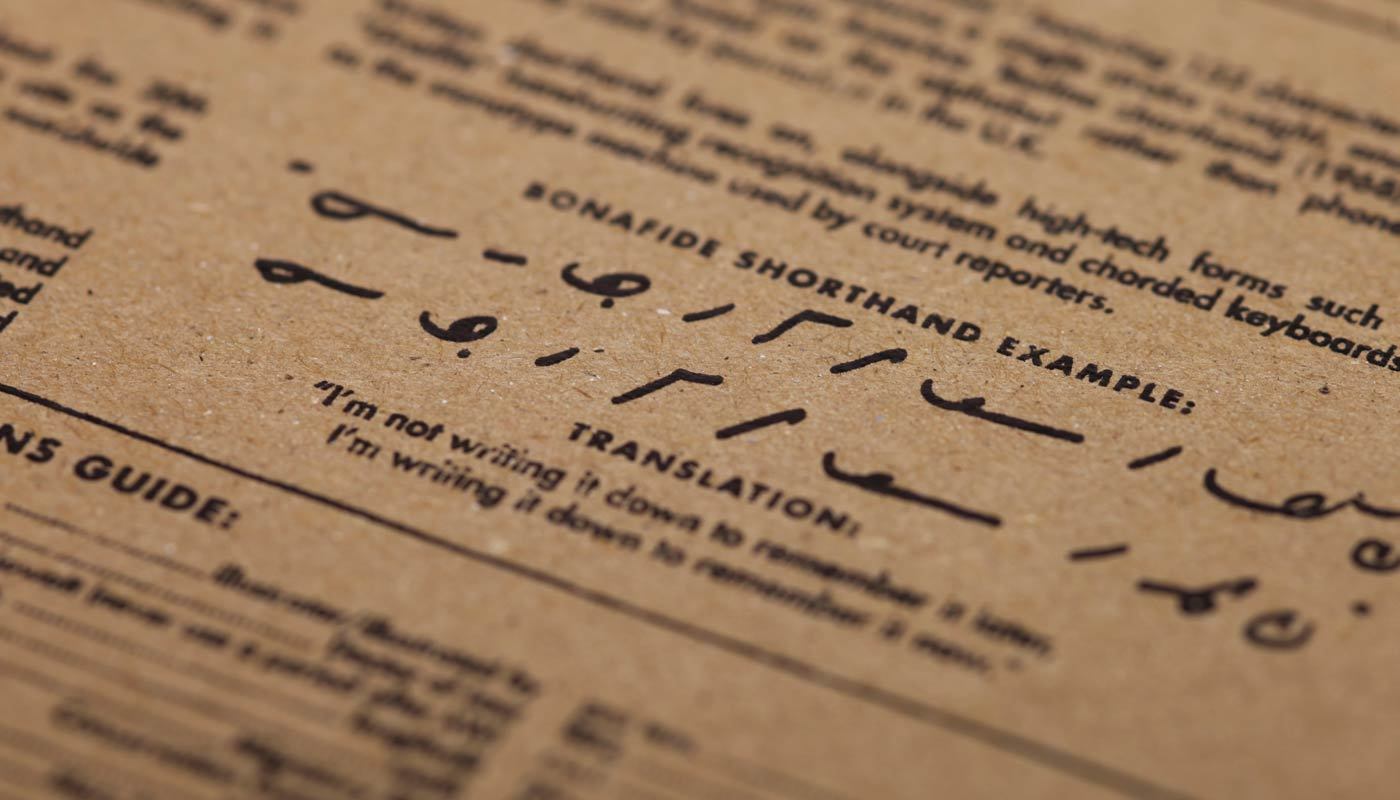 The Steno is 6" by 9" with a black “Double-O Wiring” spiral at the top so it lies flat, open or closed. Inside you’ll find 80 pages of 70# “Bright White” paper Gregg-Ruled with a fine, soy-based application of “Double Knee Duck Canvas” light brown ink. The covers are 60 pt. “Super Duty Chipboard,” with a screen-printed 1-color application of “Dictation Smudge” black ink.