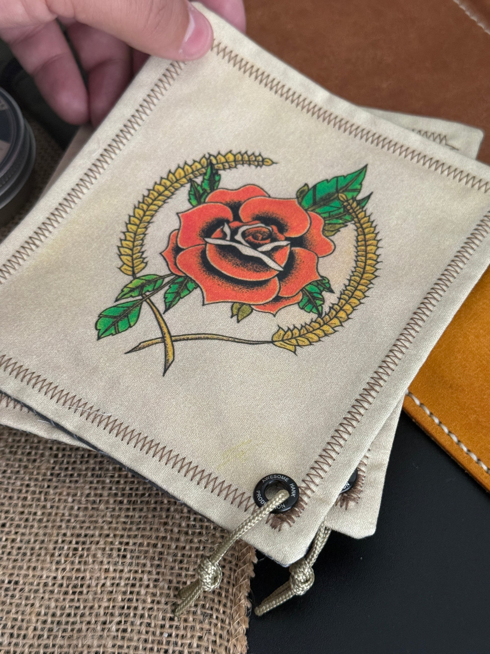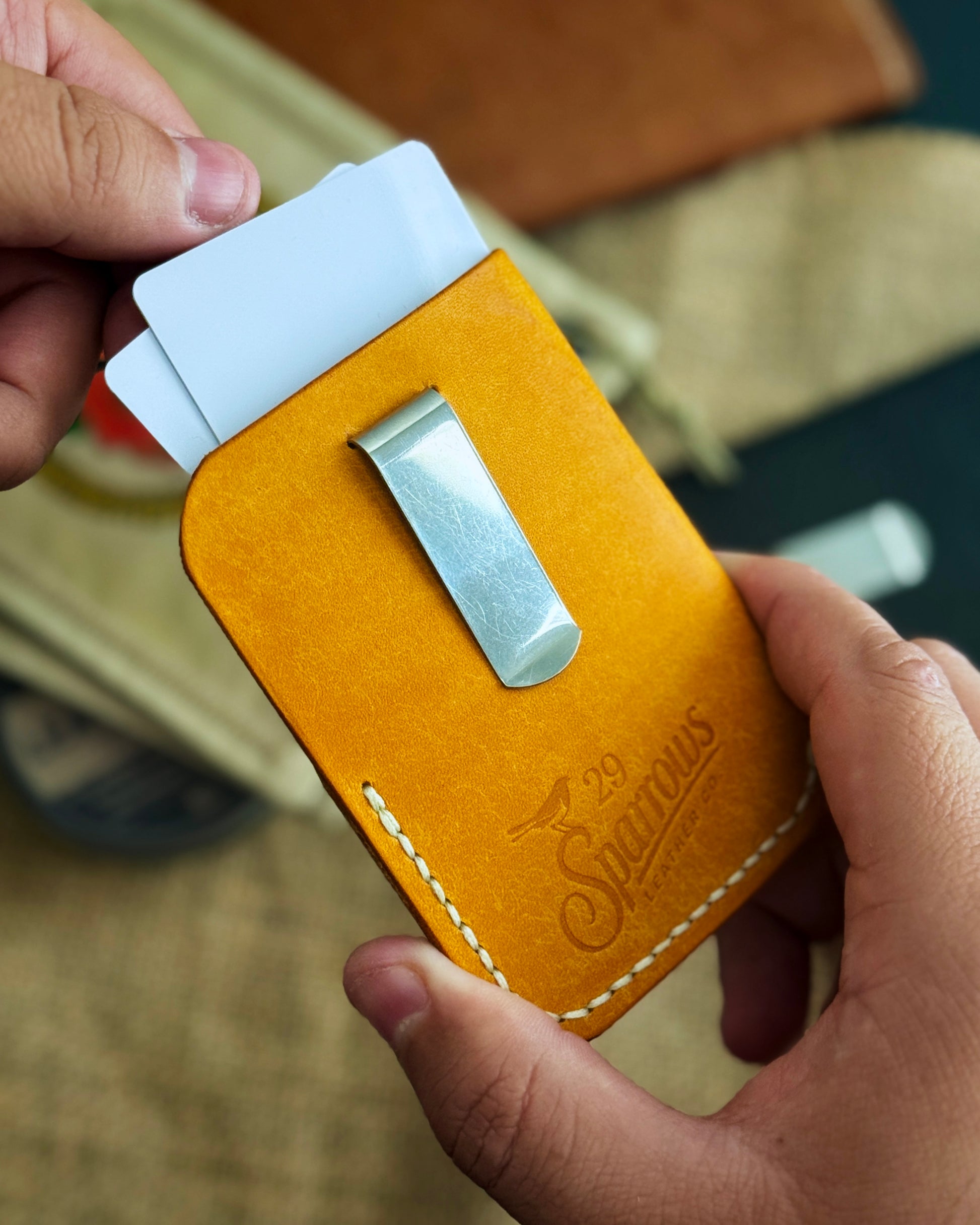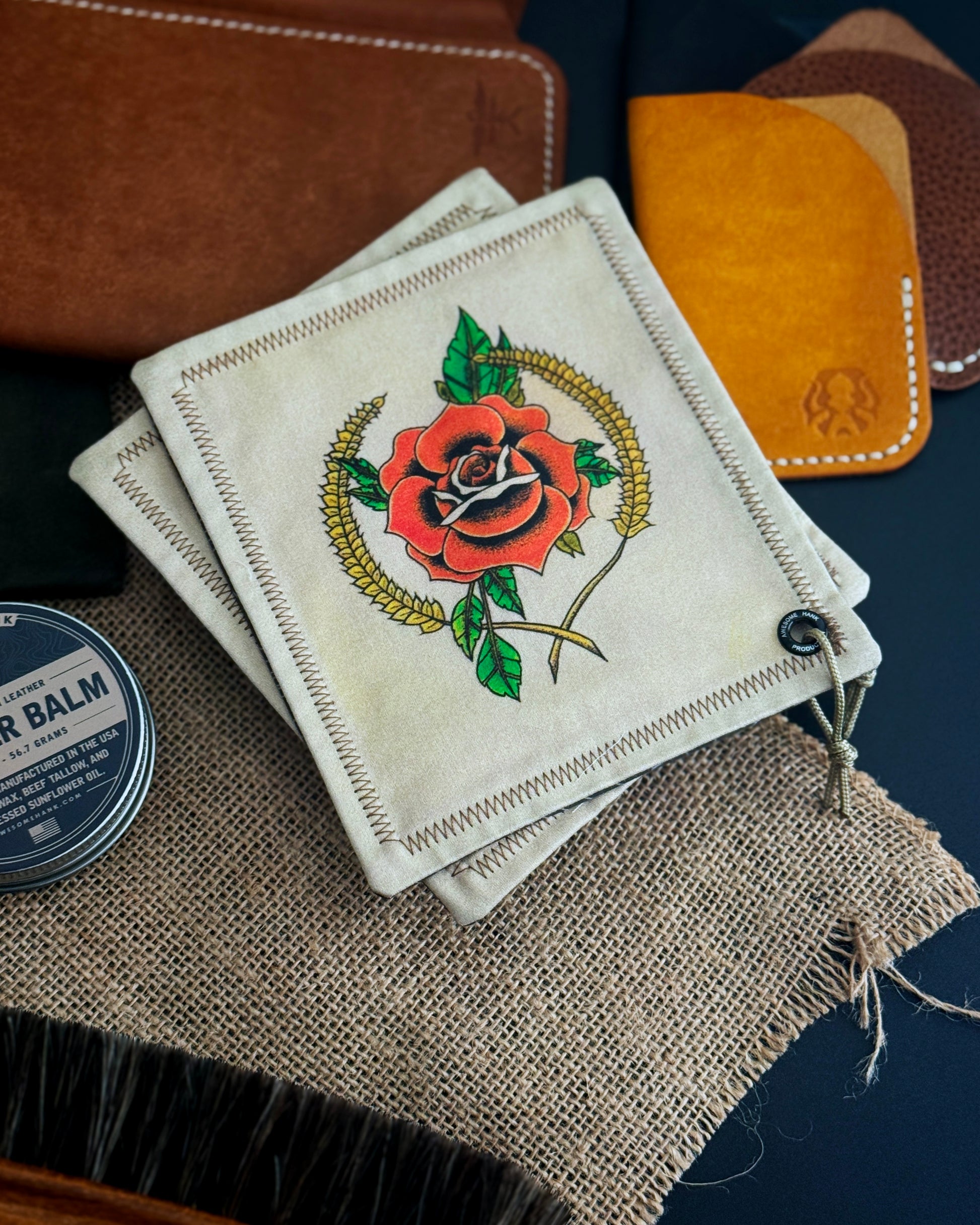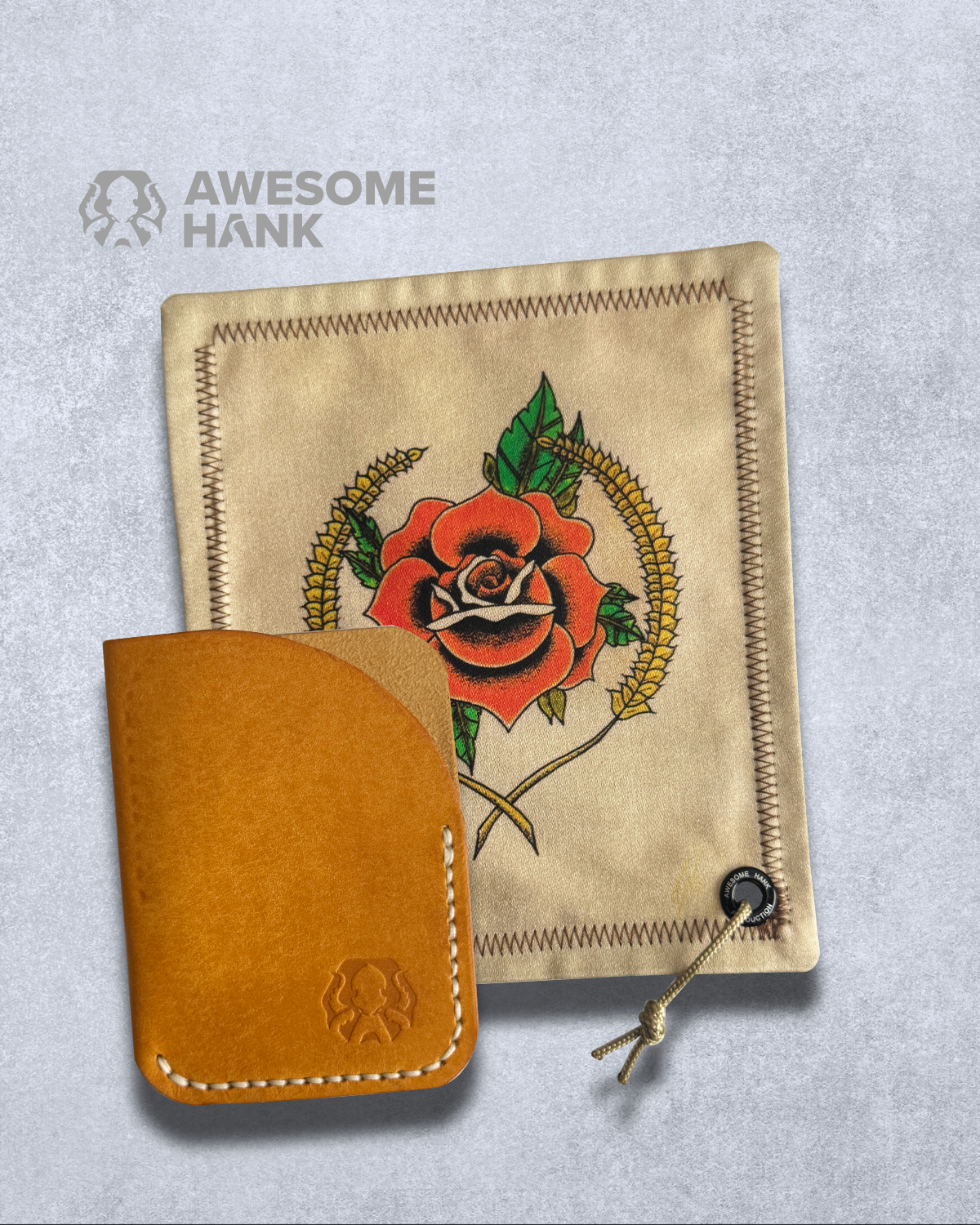 29SPARROWS LEATHERS CO. & AWESOME HANK BUNDLE PACK - MODERN EVERYDAY CARRY HANDKERCHIEF FEATURING A COLLABORATIVE "HOLD FAST" ROSES AND BREAD ILLUSTRATION HANK AND A HANDCRAFTED LEATHER CARD WALLET WITH MONEY CLIP. BUNDLE COMES STANDARD WITH A YELLOW VEG TAN PUEBLO CARD WALLET, WITH A CHANCE TO GET A CHASE COLOR OPTION IN BLACK OR BROWN LEATHER. (A FEW BUNDLES WILL FEATURE THE RARE CHASE COLORS AT RANDOM INSTEAD OF THE STANDARD YELLOW WALLET). CARD WALLET CAN HOLD 5-7 CARDS AND A FEW BILLS.
