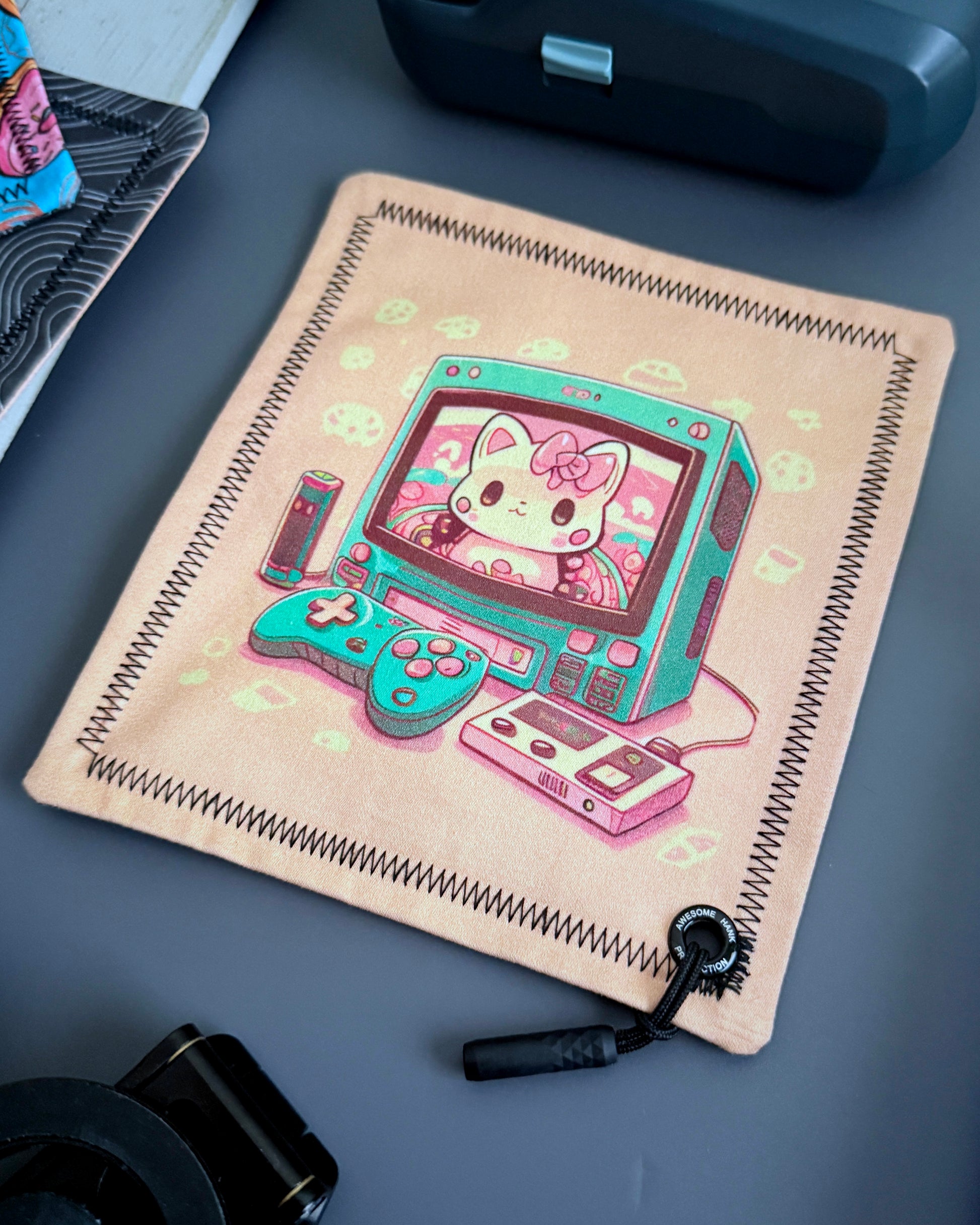 MODERN EVERYDAY CARRY HANDKERCHIEF FEATURING A FUN PINK KAWAII GAMER CAT SETUP PRINT. LENS GRADE MICROFIBER BACKING TO KEEP YOUR DAILY ESSENTIALS SMUDGE-FREE.