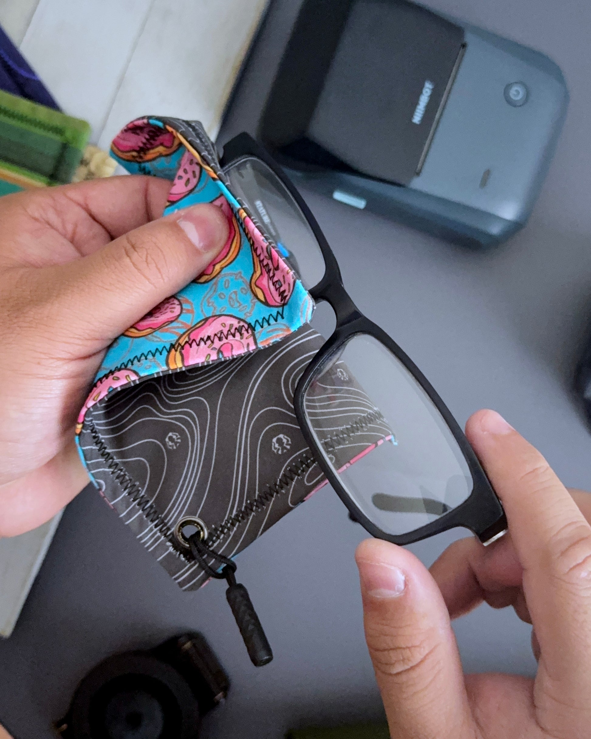 MODERN EVERYDAY CARRY HANDKERCHIEF FEATURING A PINK FROSTING DONUT PATTERN WITH BLUE BACKGROUND. LENS GRADE MICROFIBER BACKING TO KEEP YOUR DAILY ESSENTIALS SMUDGE-FREE.