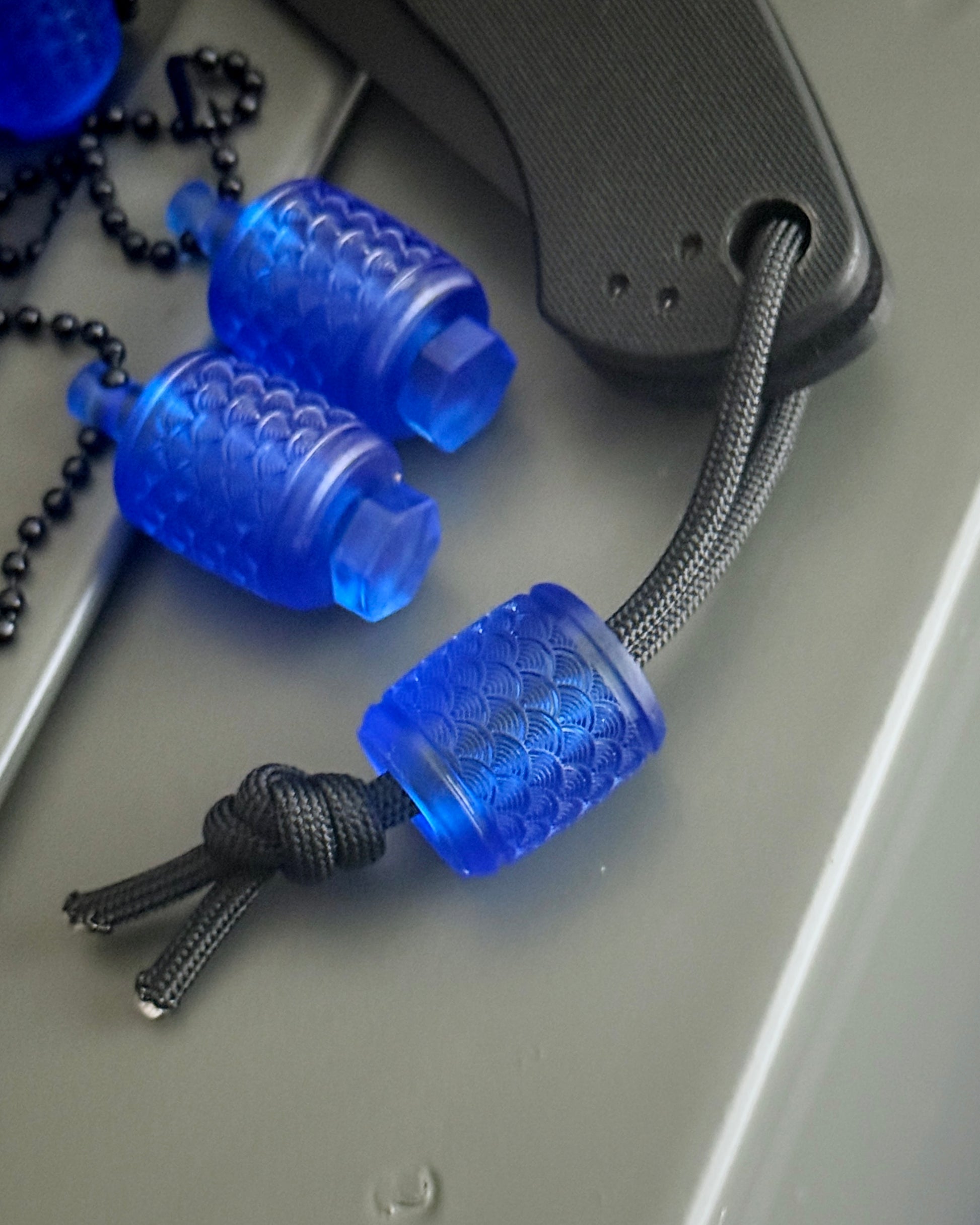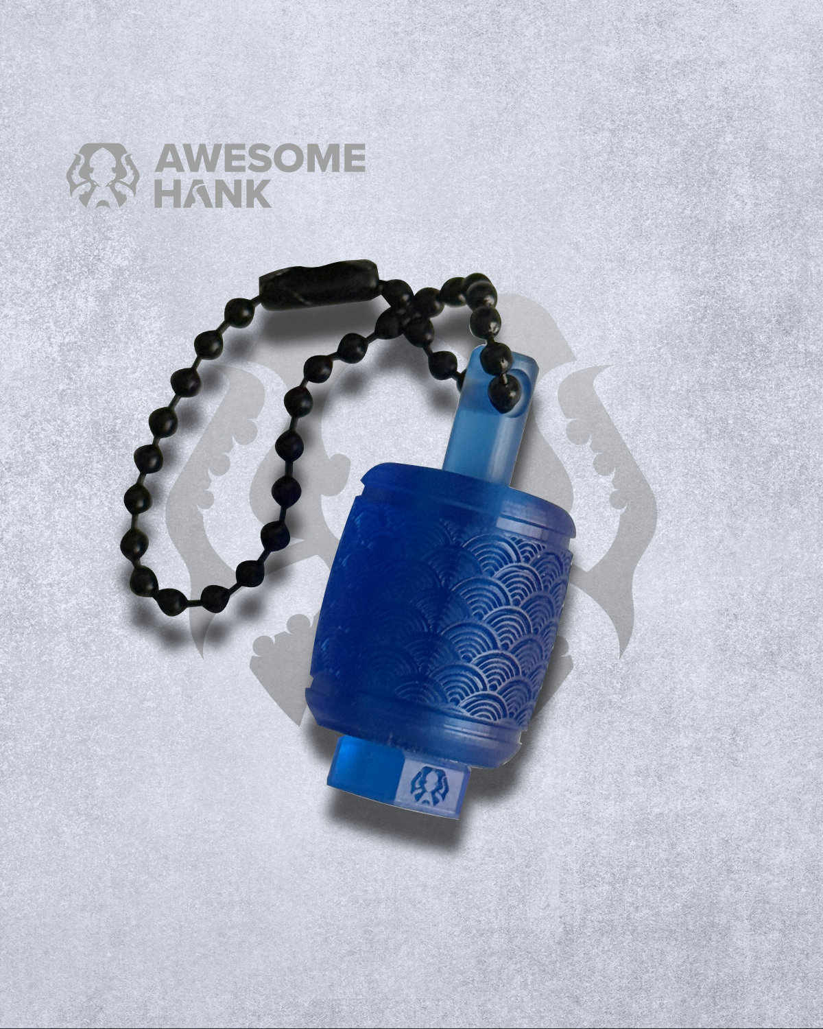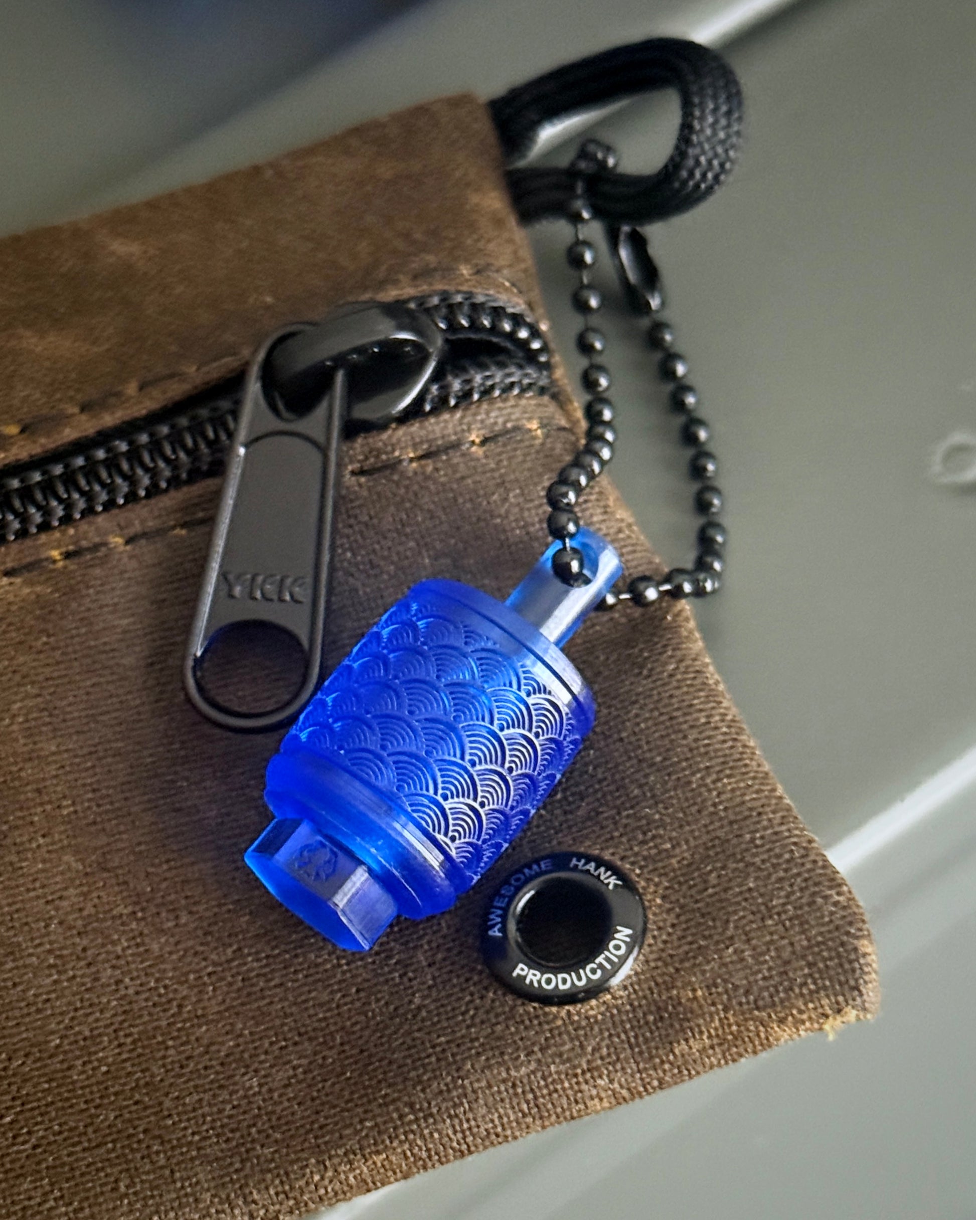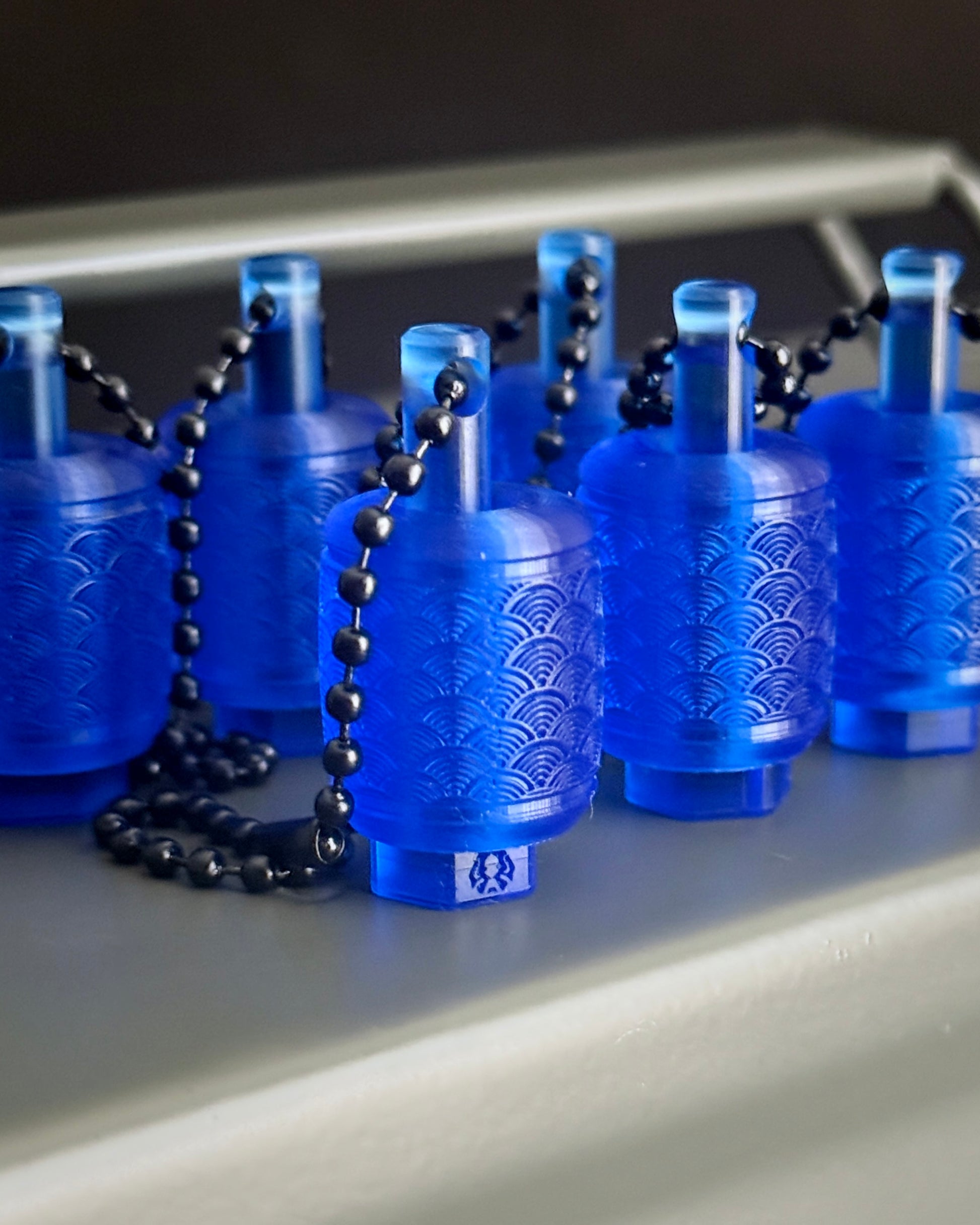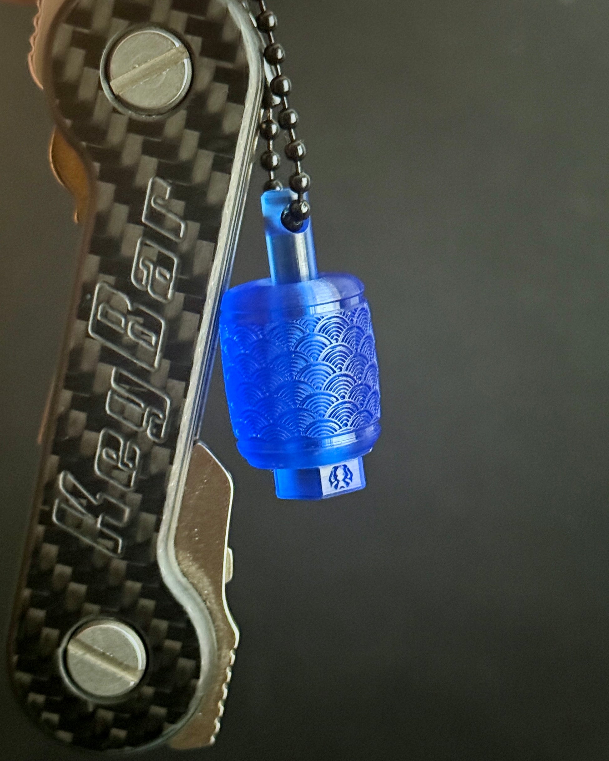 3D PRINTED, HAND FINISHED SEIGAIHA BEAD WITH A KEEPER AND CHAIN (LANTERN CARRY). BEAD FEATURES A TRANSLUCENT NAVY BLUE COLORWAY AND A SEIGAIHA WAVES PRINT. DESIGNED AND MADE HERE IN THE USA BY OUR FRIENDS OVER AT "8 BIT BUGOUT" - BEAD AND KEEPER ARE GREAT ADDITION FOR YOUR KEYS, EDC GEAR, ZIPPER, AS CHARM, ETC.