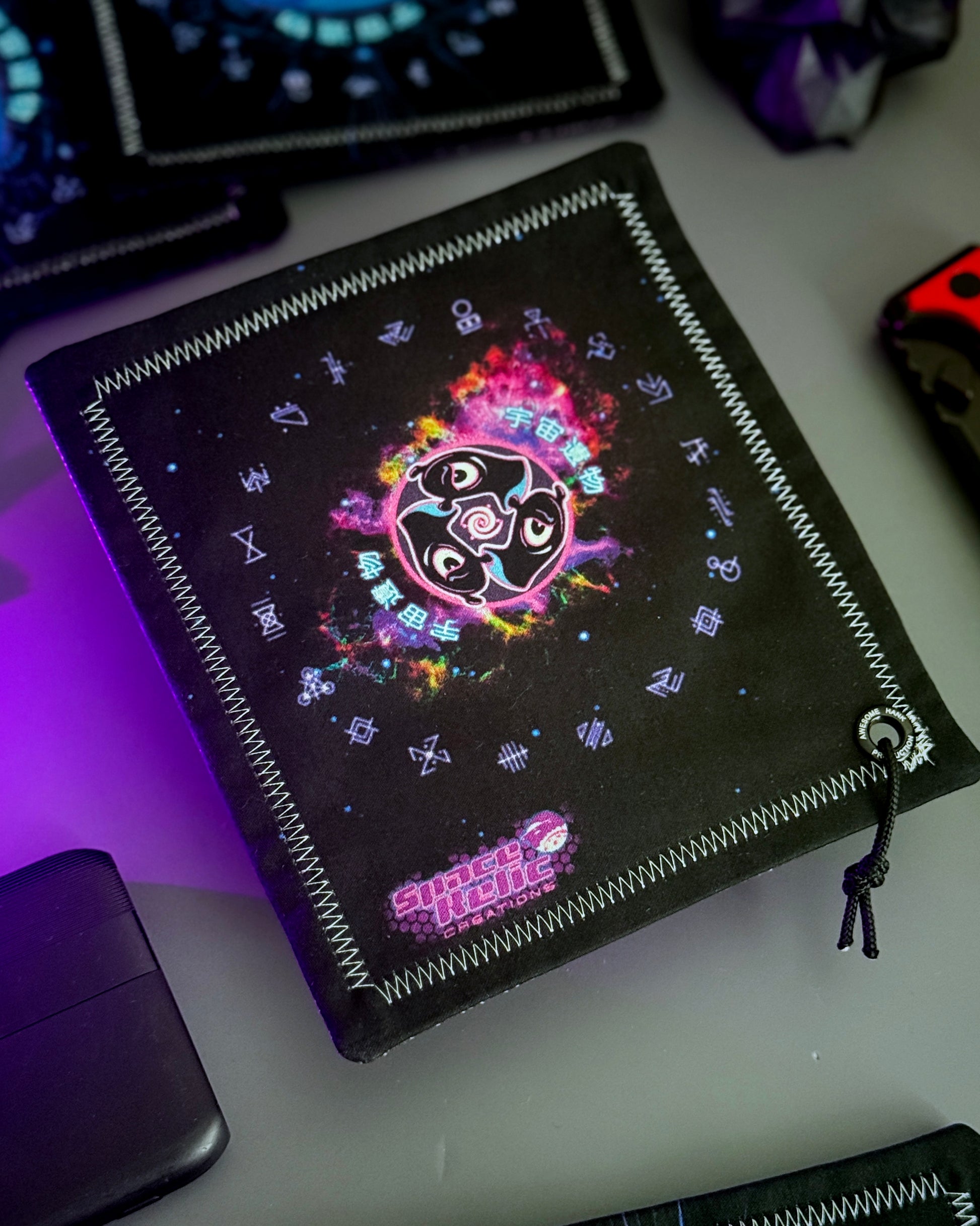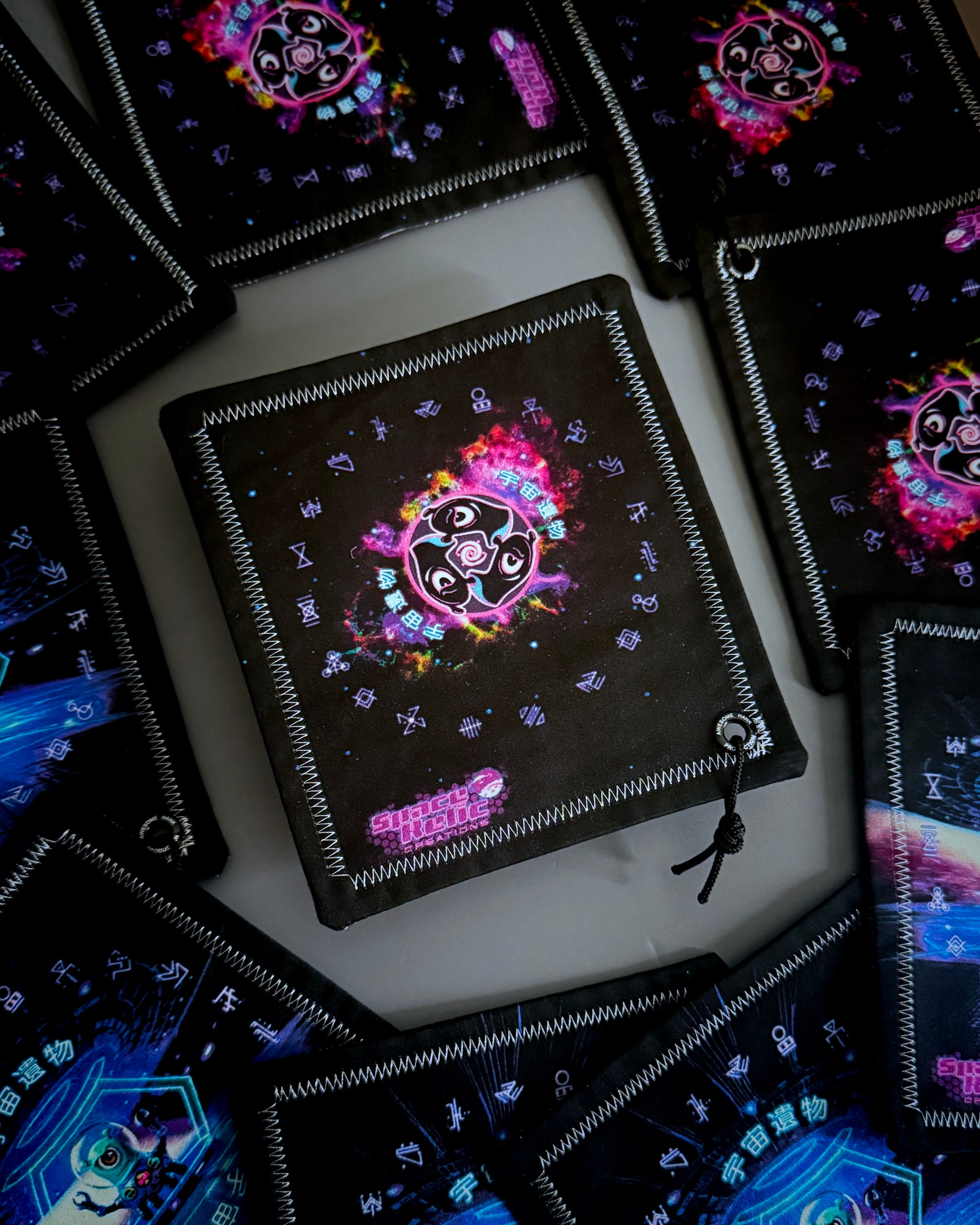 COLLABORATIVE MODERN EVERYDAY CARRY HANDKERCHIEF WITH SPACE RELIC CREATIONS FEATURING A GALACTIC NEBULA ILLUSTRATION. LENS GRADE MICROFIBER BACKING TO KEEP YOUR DAILY ESSENTIALS SMUDGE-FREE.