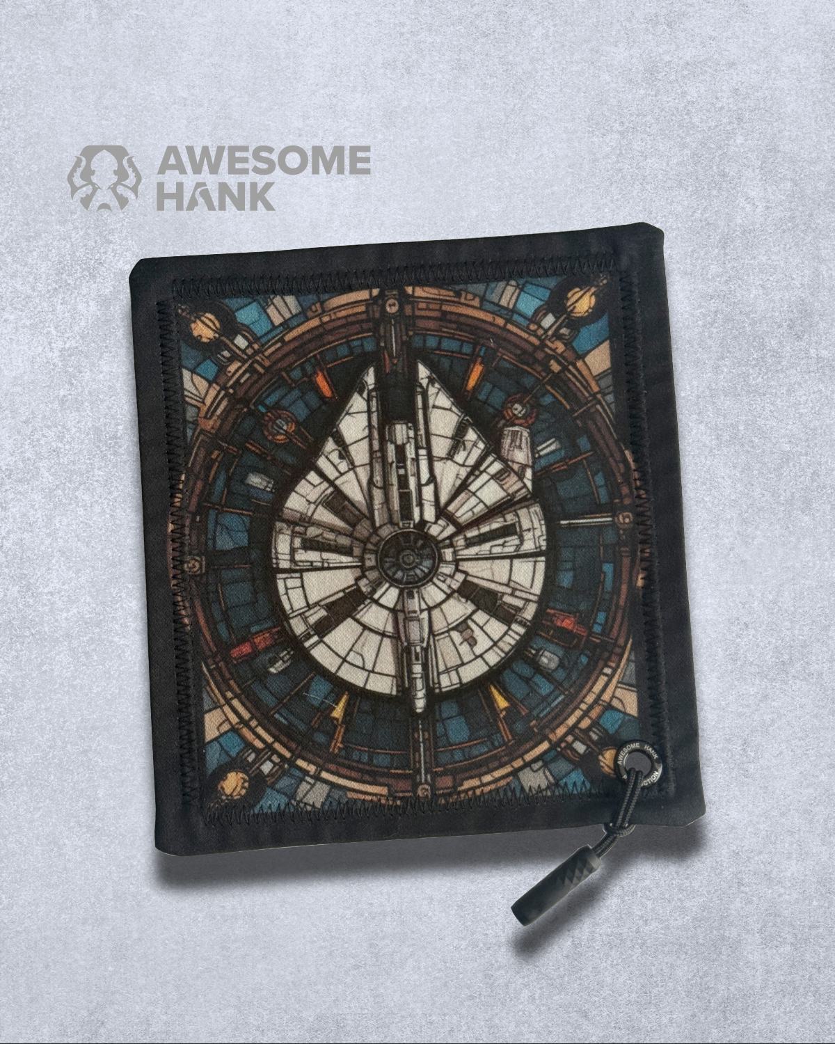 MODERN EVERYDAY CARRY HANDKERCHIEF FEATURING A STAINED GLASS FALCON ILLUSTRATION (NEW NOIR VERSION, BLACK BACKGROUND). LENS GRADE MICROFIBER BACKING TO KEEP YOUR DAILY ESSENTIALS SMUDGE-FREE.