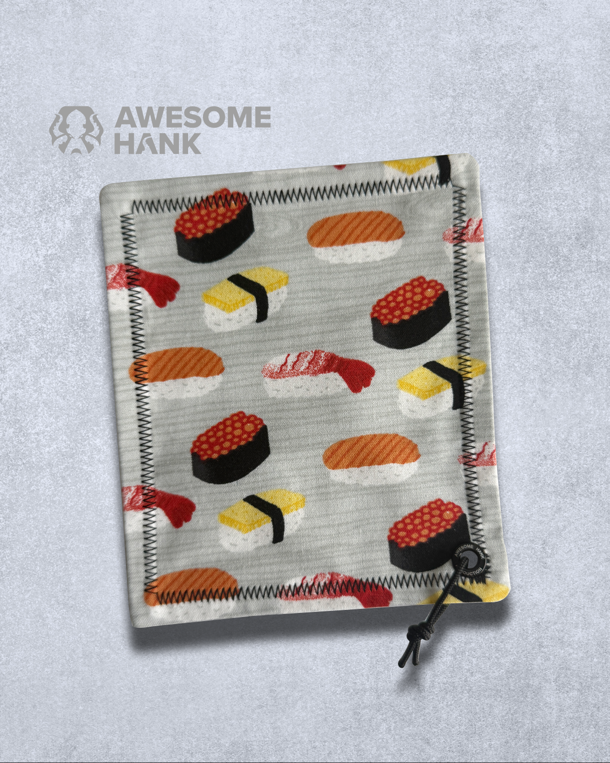 MODERN EVERYDAY CARRY HANDKERCHIEF FEATURING A SUSHI MEDLEY PATTERN. LENS GRADE MICROFIBER BACKING TO KEEP YOUR DAILY ESSENTIALS SMUDGE-FREE.