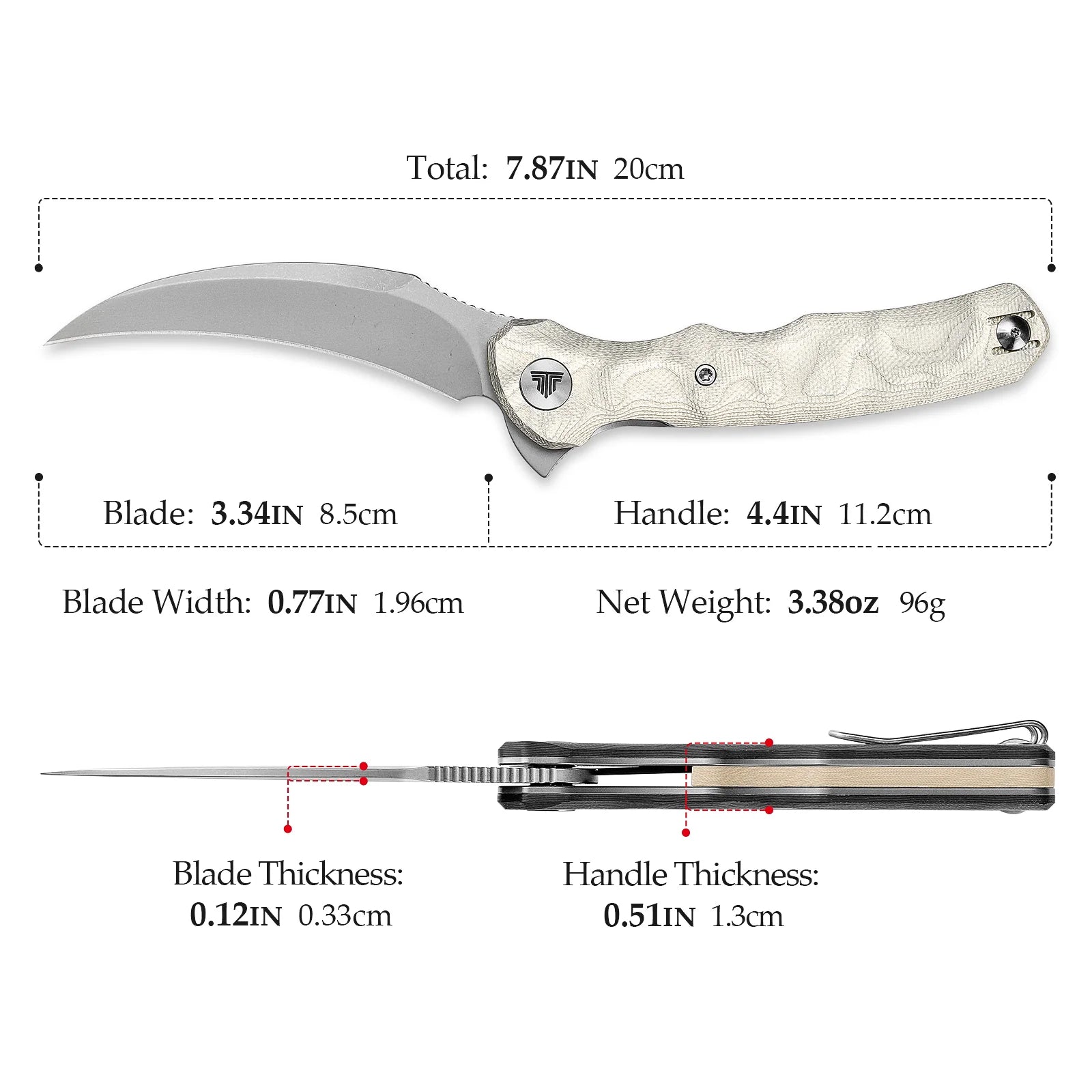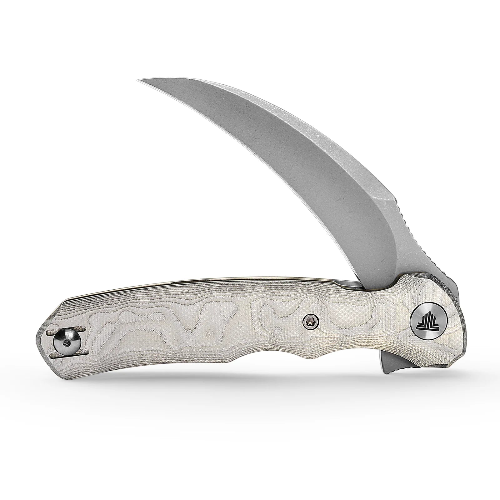 THE TRIVISA KNIVES LACERTA IS THE PERFECT EDC / UTILITARIAN COMPANION. FEATURES A 3.34" HAWKBILL STYLE BLADE, LINER LOCK, AND REVERSIBLE POCKET CLIP. THE LACERTA EDC KNIFE IS DESIGNED TO TACKLE DAILY TASKS, FOR CAMPING, BACKPACKING AND CASUAL CARRY. THIS VARIANT COMES WITH AL-ALUMINUM FOIL HANDLES AND A STONEWASH BLADE.